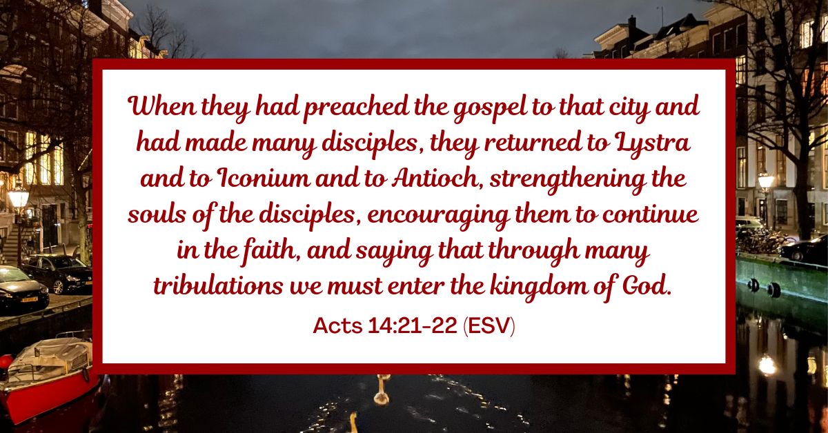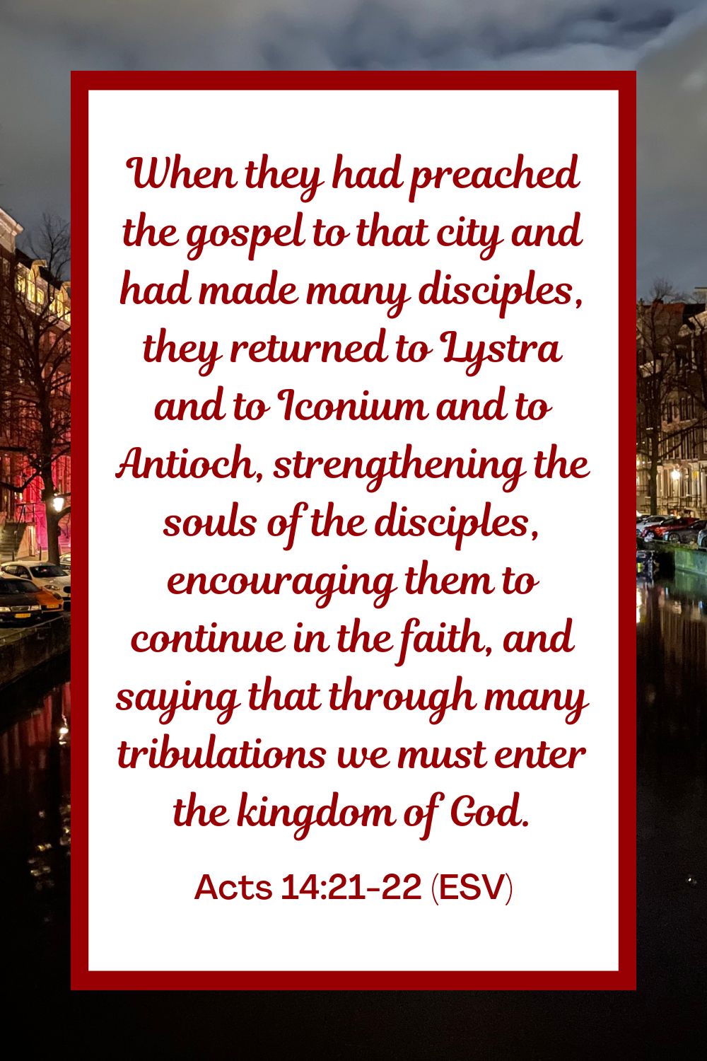 When they had preached the gospel to that city and had made many disciples, they returned to Lystra and to Iconium and to Antioch, strengthening the souls of the disciples, encouraging them to continue in the faith, and saying that through many tribulations we must enter the kingdom of God.