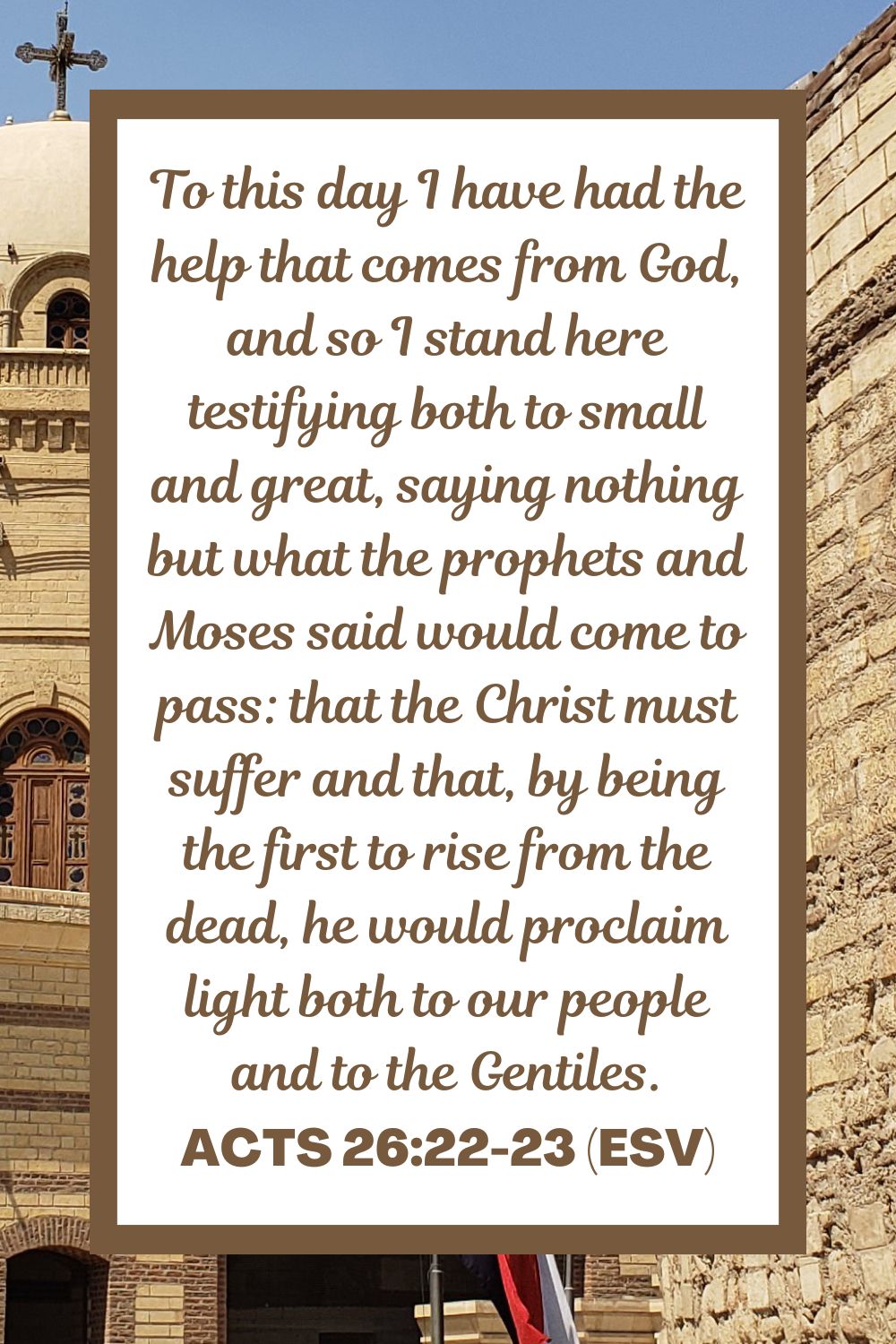 To this day I have had the help that comes from God, and so I stand here testifying both to small and great, saying nothing but what the prophets and Moses said would come to pass: that the Christ must suffer and that, by being the first to rise from the dead, he would proclaim light both to our people and to the Gentiles.